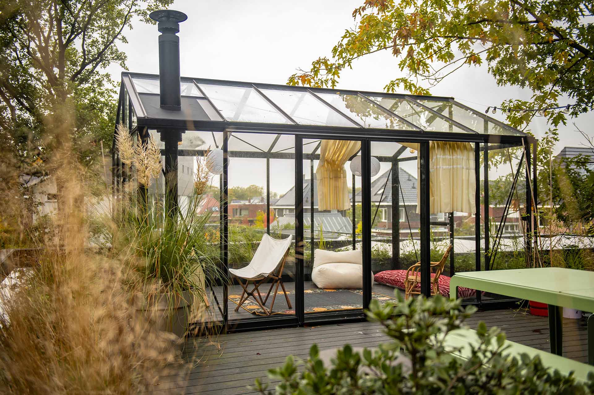 Een tuinkas op het dak is niet direct waar men aan zal denken, dit was echter de wens van onze klant. Een plek waar ze heerlijk kunnen loungen. Een tuinkas wordt gezien als een traditionele ruimte waar men in kweekt, maar de tuinkas is ook uitstekend te gebruiken als loungekas. Het strakke minimalistische design geeft een moderne en industriële uitstraling, goed voor in bijna elk tuinontwerp.